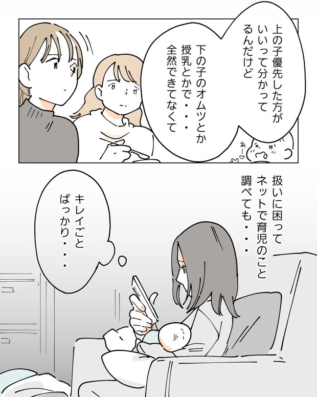 「上の子を優先した方がいいって分かってるんだけど、下の子のオムツとか授乳とかで全然できてなくて、扱いに困ってネットで育児のこと調べても。それができないから困ってるんだよ。って卑屈になる自分もいて。」ナオの話を、私たちは相づちを打ちながら静かに聞きます。