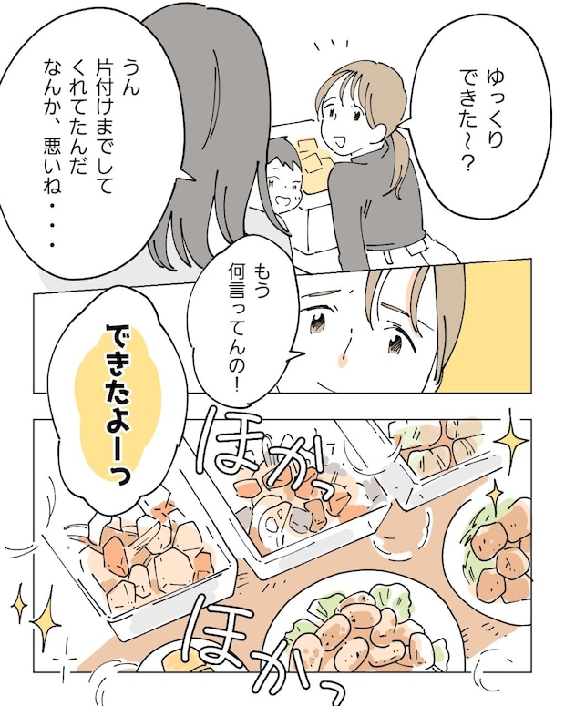 「ゆっくりできた?」そう声をかけると、ナオは「うん、片付けまでしてくれてたんだ・・・なんか悪いね」と控えめに微笑みます。私はそんなナオを励ますように、「もう、何言ってんの!」と明るく返しました。そのとき、キッチンから「できたよーっ」とよっちゃんの声が。机の上に目をやると、美味しそうな品々がズラリと並んでいました。
