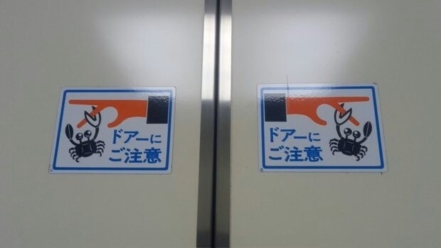 「ドアーにご注意」という文字と共に、カニが指を挟んで警告しているステッカー、子どものころに見ると怖かったのに大人になって見てみると、なんだか懐かしく感じます。