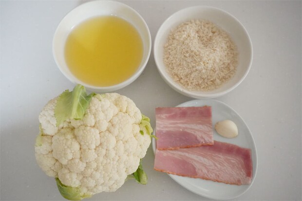1. カリフラワーは小房に分ける。ベーコンはみじん切りにし、にんにくはすりおろす。