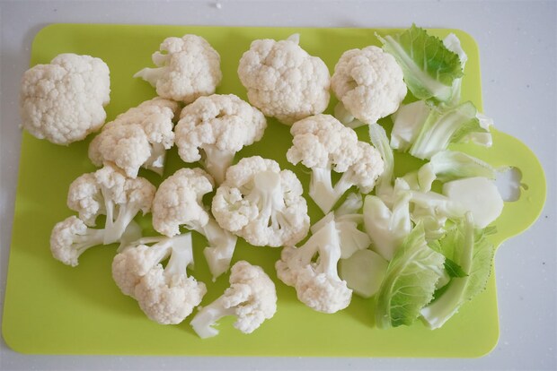 カリフラワーは、葉や芯も食べやすい大きさに切りました。