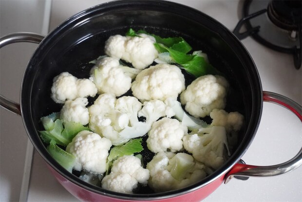 2. 鍋に湯を沸かし、塩ひとつまみを入れてカリフラワーを茹で、ザルにあげる。