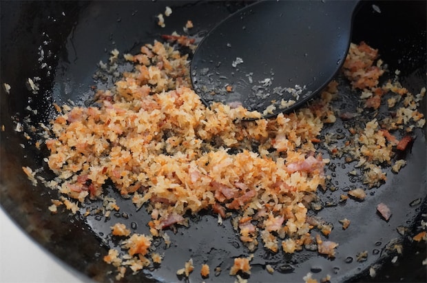 4. 3にパン粉を加えてカリカリになるまで炒め、塩・こしょうを振って味を調える。