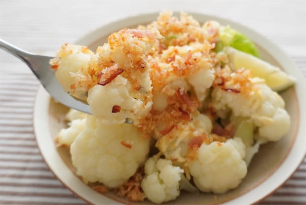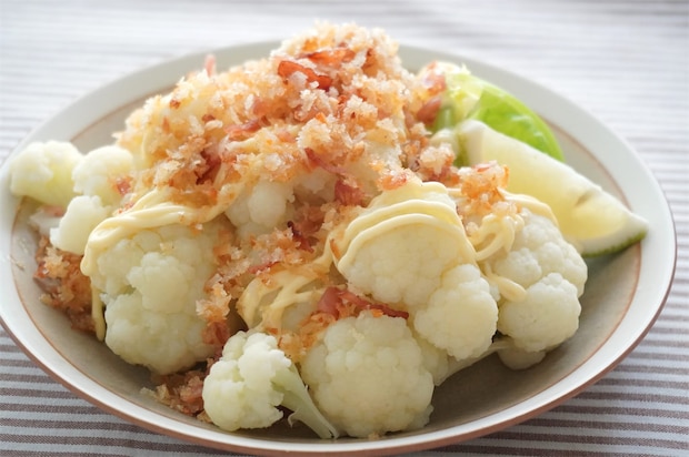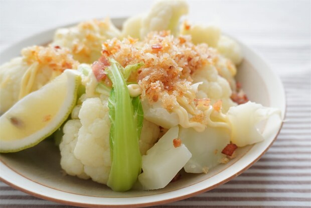 カリフラワーと相性抜群のカリカリソースをかけた「カリフラワーのカリカリソースがけ」。半端に余りがちな少量のベーコンやパン粉を使って、簡単に作れるのでおすすめです。みなさんもぜひ作ってみてくださいね♪