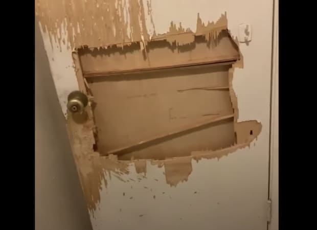 部屋中めちゃくちゃ、ドアは破壊されてました。