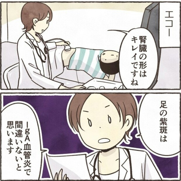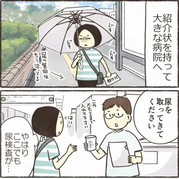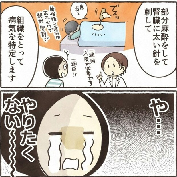 紹介状を持って大きな病院へ向かったきなこさん。ここでも尿検査を受けることになりました。エコー検査の結果や病名の説明を聞く中で、先生から提案されたのは腎生検という検査でした。その内容を聞いたきなこさんは、やりたくない…と心の中で嘆きます。