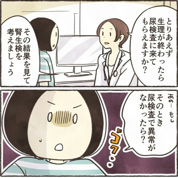 腎生検の内容を聞いたきなこさんは、やりたくないと心の中で嘆きます。尿検査の結果を見て腎生検をするか決めることとなりました。