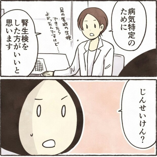 エコー検査では腎臓に異常は見られず、病気を特定するために「じんせいけん」をした方がいいと勧められます。