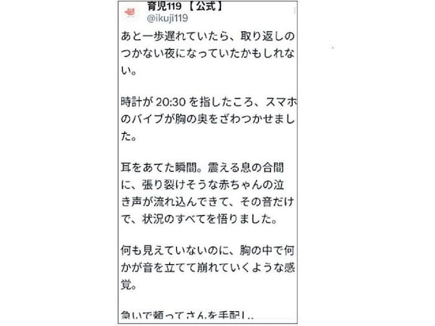 「育児119」は電話やLINEで育児の困りごとを聞き、アドバイスをしたり「頼ってさん」という人材を自宅に派遣する24時間体制のサービスです。以下は、「育児119」が実際に対応したサポートの内容をXに投稿したものです。
