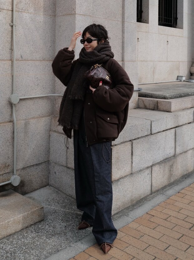 「ブラウンのフリースコートに、同色のニットストールを合わせたワントーンスタイル。小物もブラウンで統一しましたが、レザー・フリース・パイソン・ニットなど異素材の組み合わせにして、立体感のあるコーデを意識したのもポイントです」