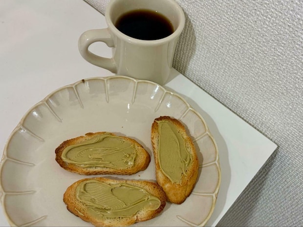 そこに、温かいブラックコーヒーをひと口含んでみてください。 ここからが本当の魔法。コーヒーの心地よい苦味が、スプレッドの強い甘みをスッと引き締め、隠れていたピスタチオの香ばしさをさらに鮮明に引き立ててくれるのです。