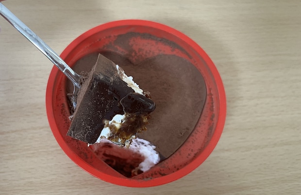 スプーンを垂直に差し込むと、「パリッ」という小気味よい音が手に伝わってきました。この正体は、表面のココアパウダーの下に隠されたチョコレート層。蓋に「BROKEN HEART」と書いてあるように、ハートのチョコレートをパキパキ割って食べていきます。このパリパリが楽しい!
