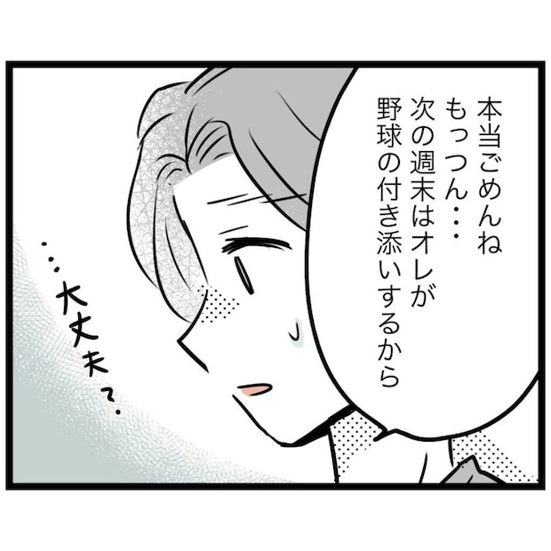 居心地の悪いスポ少野球の打ち上げから、疲労困憊で帰ってきたもっつんさんを、夫が出迎えます。