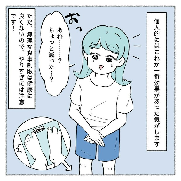 ご飯は一口くらいの量に、麺は糖質オフのものに変えます。物足りなさを感じる夕食に「ひもじい…」と思うりったさんですが、個人的にこの「炭水化物を減らす」が一番効果を感じたそう。