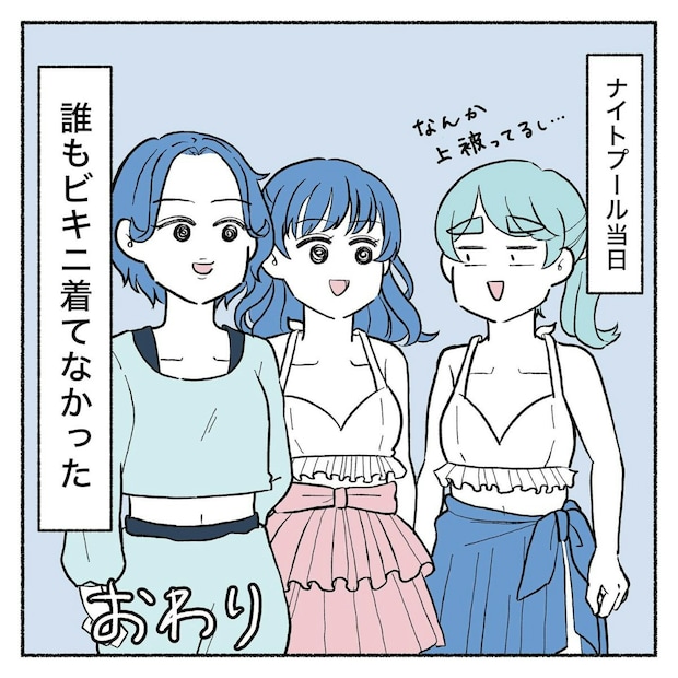 りったさんが実行したダイエットは3つ。「間食や甘いものを控える」「炭水化物を減らす」「運動」でした。そして目標だったナイトプールの日、りったさんを含め、誰もビキニを着ていなかったという、トホホなオチが待っていました。