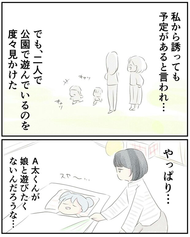 子ども同士だって、相性がありますよね。狭い交友関係だらこそ、わざわざ合わない人と付き合いたいとは思いません。自分とわが子のために、ほどよい距離感で付き合うことは大切ですね。