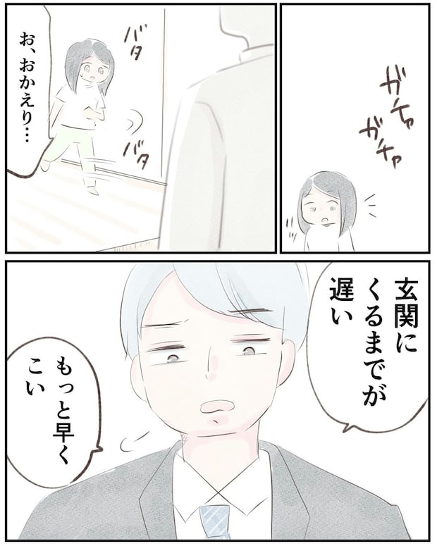 玄関から音がするので慌てて向かうと、夫はゆうさんの行動の遅さに呆れたように怒っていました。そんな夫は、明日は宗教の集まりがあるようです。