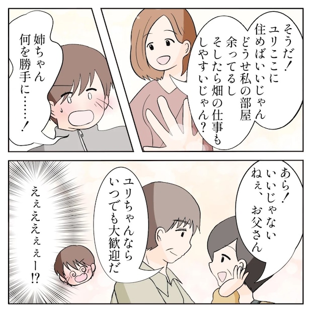 その時、「そうだ!ユリここに住めばいいじゃん。どうせ私の部屋余ってるし、そしたら畑の仕事もしやすいじゃん?」姉ちゃんがいいこと考えたとばかりに提案し、それを聞いた俺は「姉ちゃん、何を勝手に・・!」と言いながら顔が熱くなりました。すると、「あら!いいじゃない。ねぇ、お父さん」「ユリちゃんなら、いつでも大歓迎だ」と笑顔で言い合う母さんと父さん、俺は「えぇええぇぇー!?」と驚きで声が出ませんでした。