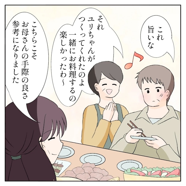 「これ旨いな」と感心する父さんに、「それユリちゃんが作ってくれたのよ。一緒にお料理するの楽しかったわ~」と母さんが嬉しそうに言うと、「こちらこそ。お母さんの手際の良さ参考になりました」と謙遜するユリ姉。