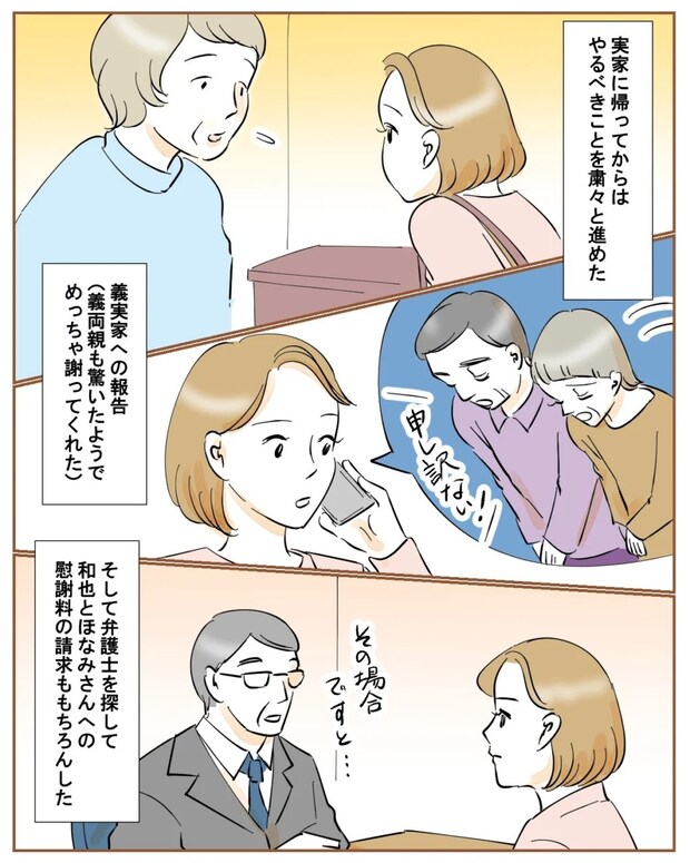 実家に帰った私は、感傷に浸ることもなく離婚の準備のためにやるべきことを粛々と進めました。義理の両親に報告すると、和也の不倫に驚いた2人は何度も何度も謝ってくれました。それから私は弁護士を探し、和也と保奈美さんへの慰謝料の請求ももちろん相談しました。平和な結婚生活を送っていたのに、付き合って3ヶ月の彼女といたいから離婚して欲しいだなんて、自分勝手すぎる理由を黙って受け入れるわけにはいかない。そう思いました。