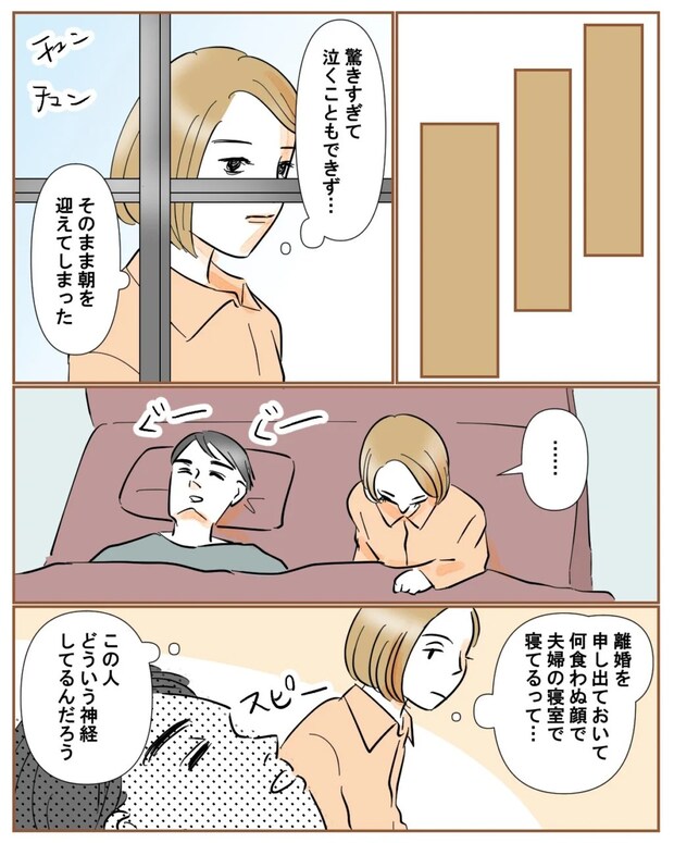 あまりにもショックで一睡もできないまま朝を迎えましたが、自分勝手な理由で離婚を切り出しておきながら、私の隣で何食わぬ顔でぐっすり眠っている和也を見て、どういう神経をしているんだろうと呆れました。