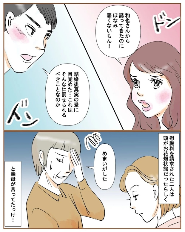 慰謝料を請求された夫は「結婚後、真実の愛に目覚めた。これはそんなに罰せられるべきことなのか」と真顔で言い、また不倫相手のほなみさんは不満全開の顔で「和也さんから誘ってきたのに。ほなみ、悪くないもん!」と言い放ちました。あまりの脳内お花畑状態の2人に、義母もさすがに呆れたようで、めまいがしたと言っていました。同感ですよ、お義母さん・・・。