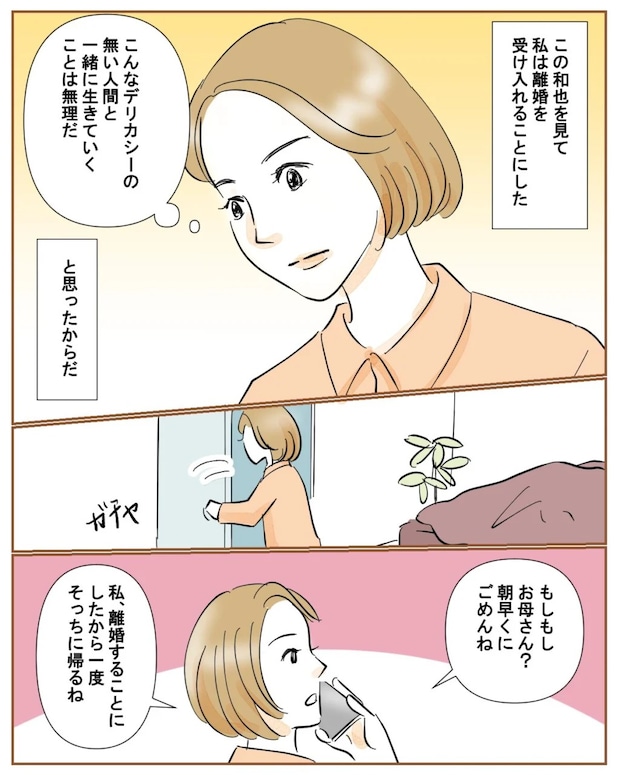 眠っている和也を見て、私は離婚を受け入れることに決めました。こんなにもデリカシーの無い人間と、これ以上一緒に生きていくことは無理だと理解したのです。心が決まった私はさっさと起きて実家に電話し、離婚することを伝えました。やっぱり涙なんて出てきませんでした。