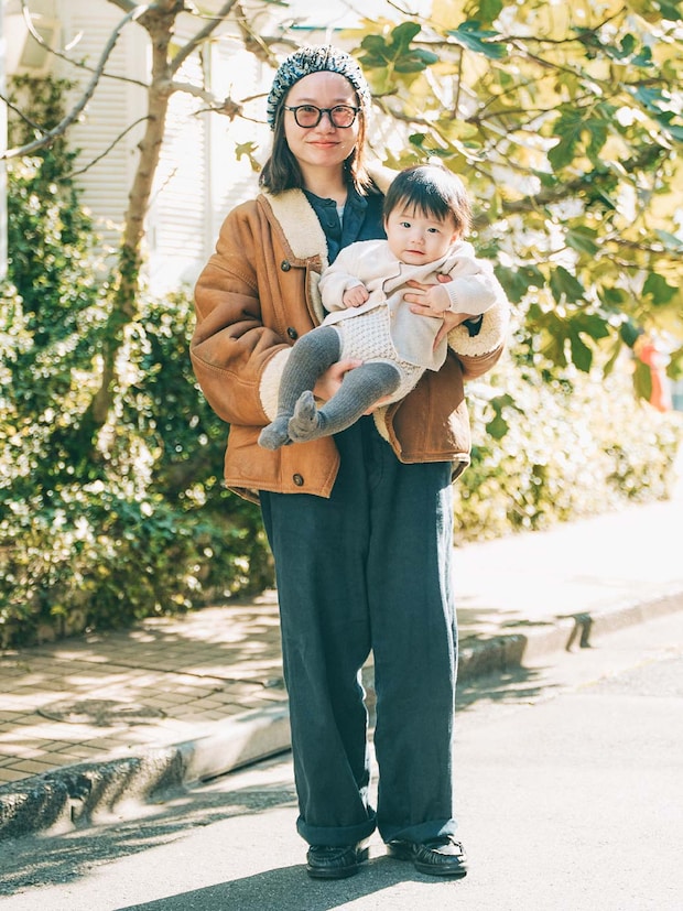 オーバーサイズなムートンアウターを、華やかなニット帽でぐっど引き締めて、バランスをとったテクはお見事! ベビーはオールニットコーデで季節感抜群な装いに昇華。落ち着いたトーンで揃えた、こなれ感ある親子コーデの完成♪