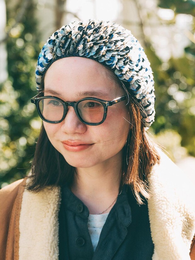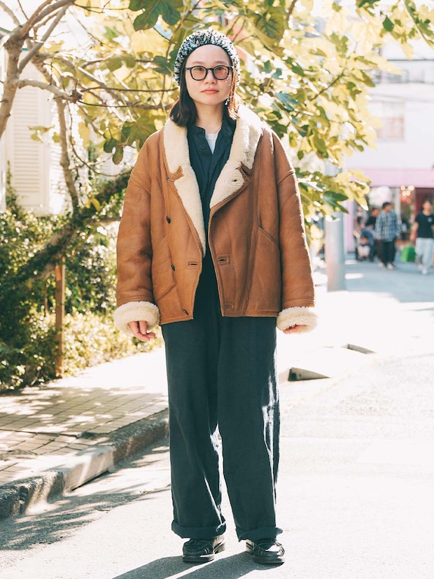 コーデの主役は古着屋でゲットした、輝くスパンコールハット! 冬のダークトーンに遊び心をプラスするテクニックは必見。