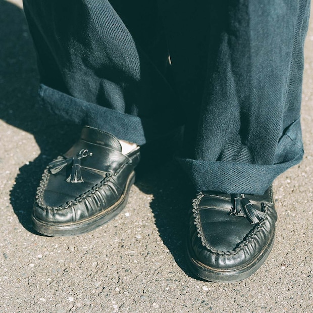 ブラックのタッセルローファーでクラシカルな足元にアップデート。裾をロールアップして、シューズをメインにした着こなしがおしゃれ!