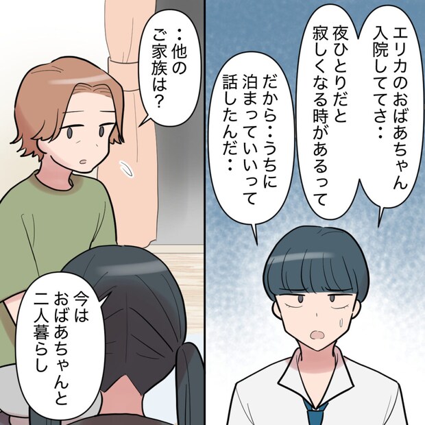 理由を聞くと、「エリカのおばあちゃん入院しててさ・・夜ひとりだと寂しくなる時があるって。だから・・うちに泊まっていいって話したんだ」とミズキが話しました。「・・他のご家族は?」と聞くと「今はおばあちゃんと二人暮らし」と答えるエリカちゃん。