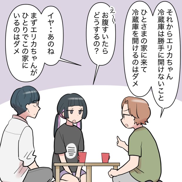 エリカちゃんがミズキ君の家に泊まっていたのは、2人暮らしのおばあちゃんが入院してしまって家に1人でいると寂しくなってしまうからでした。エリカちゃんの家庭の事情を知ったお母さんは、挨拶や気遣いもでき、素直に謝ることもできるエリカちゃんを見て悪い子ではないと感じ、寝る部屋は別という条件付きでエリカちゃんのお泊まりを許可しました。そして、内緒で泊まっていた間にエリカちゃんがキッチンも使っていたことについて思うところがあったお母さんは、ひとさまの家の冷蔵庫は勝手に開けてはいけないとマナーを教え、エリカちゃんが家主の不在中に一人で家に居ることもダメだと教えました。お母さんの言葉にエリカちゃんはとても驚いており、そんなエリカちゃんの反応にお母さんも驚いてしまいました。