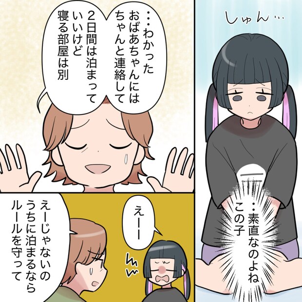 さっきまでの元気が消えしゅんとして俯くエリカちゃんを見て「・・素直なのよね。この子」と悪い子ではないと感じた私。「・・わかった。おばあちゃんにはちゃんと連絡して、2日間は泊まっていいけど、寝る部屋は別」と言うと、エリカちゃんは「えーー」と不服そうでしたが「えーじゃないの。うちに泊まるならルールを守って」と私もそこは譲らず、条件付きでのお泊まりを許可しました。