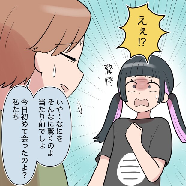 すると、エリカちゃんは「えぇ!?」と大きな声をあげ驚愕。そんなエリカちゃんの反応に「いや・・なにをそんなに驚くのよ。当たり前でしょ。今日初めて会ったのよ?私たち」と私は呆れながら言いました。