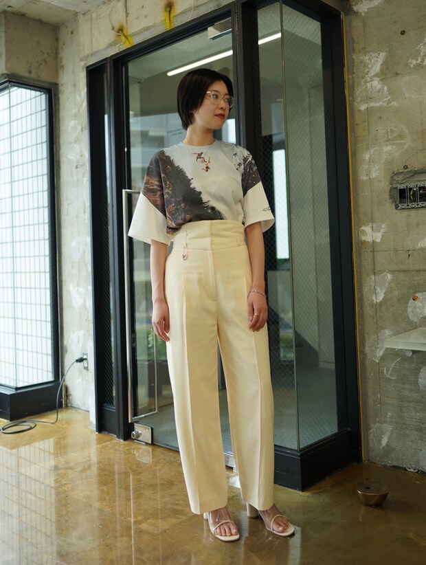 主役級の大胆なプリントTをハイウエストパンツで大人っぽく。「首元から袖、裾までの全面にカラープリントが施されたインパクトのあるデザイン。クリアなサンダルと眼鏡で個性的に、スタイリングにさり気ない遊び心をプラスしました」