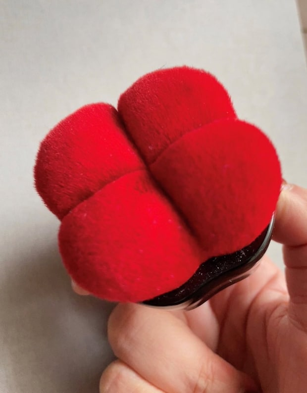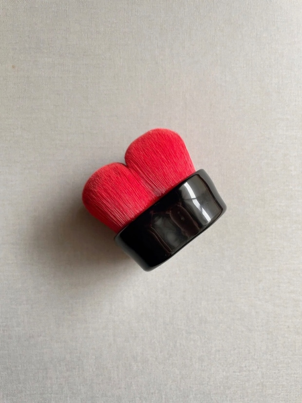 ファンデーションは基本、手で内側からフェイスラインに向かってなじませますが、最後にこの花びらのような(猫の肉球にも見える)真っ赤なブラシでクルクルと磨くと、スルンと仕上がりがなめらか&ツヤ肌になります! 粉含みもいいので仕上げのフェイスパウダーを乗せるのにもピッタリなマルチなブラシです。通常の柄を握るタイプのブラシとはぜんぜん違うこの見た目に最初は驚きましたが、使用する際、手と肌との距離が近いからなのか、すごく小回りがきくし力を入れることなく使えるのが魅力。小鼻の横などの細かな部分も楽々なじませられます。毛が赤いからなのか、汚れが目立たないのも個人的にはポイント↑