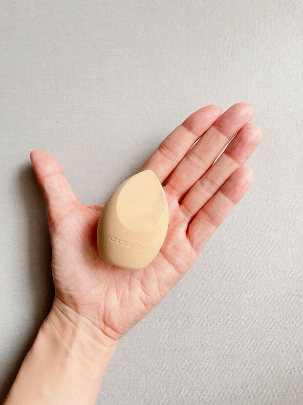 続いてはスポンジ。リキッドファンデやコンシーラーを密着させる際に使用する方が多いと思うのですが、水を含ませたスポンジでフィックスをさせると、ツヤ~んと輝くグロウ肌に仕立てることができるんです。そんな肌を目指すなら、迷わず選んでほしいのがこのアディクション。キメが細かく肌あたりが優しいこのスポンジ、水を含ませてギュッと絞るとムクッと大きく膨らみます。