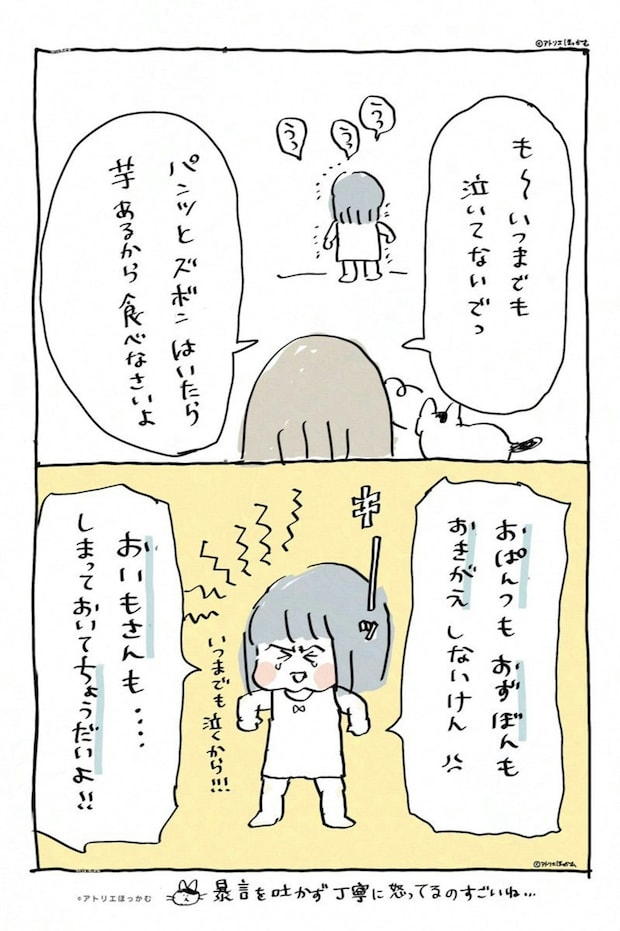 「お着替えしないけん」と、怒りながらもていねいな口調をキープする娘さん。日ごろから意識しているのでしょうか、怒りの中にも品格が感じられます。「おいもさんも…しまっておいてちょうだいよ!」と、芋は食べたいと言っているようで、かわいらしいです…!