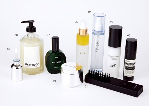01_ブライト エレキブラシ¥49,800(Aiロボティクス) 02_プロテクティブ フェイシャル ローション SPF50 PA++++ 50mL ¥7,480(イソップ・ジャパン) 03_エレクトロン タイトニングミスト ブライト 120mL ¥5,940(GM コーポレーション) 04_ルミヌ グロウミスト ローション 150mL ¥4,950(セラリー) 05_ファミュ デュアルエッセンス 100mL ¥5,720、06_パーセル ピクセルバイオーム リブーティングクリーム 50mL ¥5,610(共にアリエルトレーディング) 07_フィーリング フレグランス Rose ¥4,950(Sun and Soil/ザ グッドシングス) 08_クレンジング・洗顔ゲル¥13,750(Admisión) 09_パーセル ピクセルバイオーム フェイスセラム 30mL ¥5,940(アリエルトレーディング)