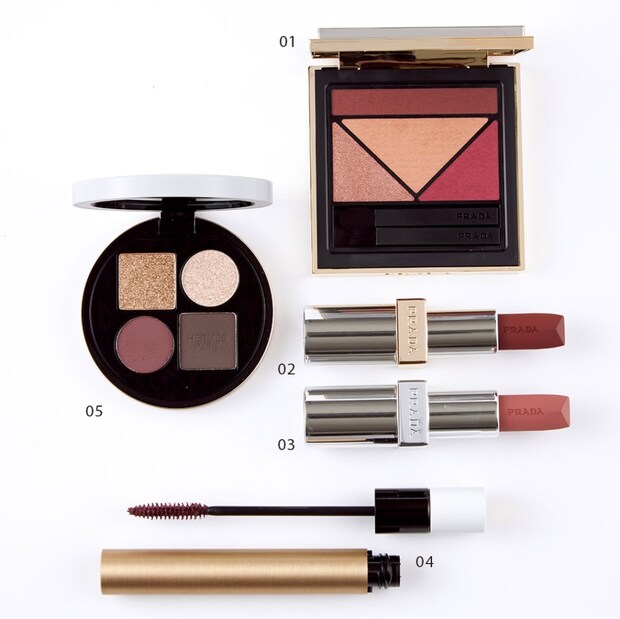 01_ダイメンションズ マルチエフェクト アイシャドウ 06 ¥12,100、02, 03_モノクローム ウェイトレス リップカラー B03、B101 各¥6,930(全てプラダ ビューティ) 04_トレ ドゥ エルメス マスカラ ボリューム 03 ルージュ ¥8,800、05_オンブル ドゥ エルメス パレット クワテュール 06 ¥14,300(共にエルメスジャポン)