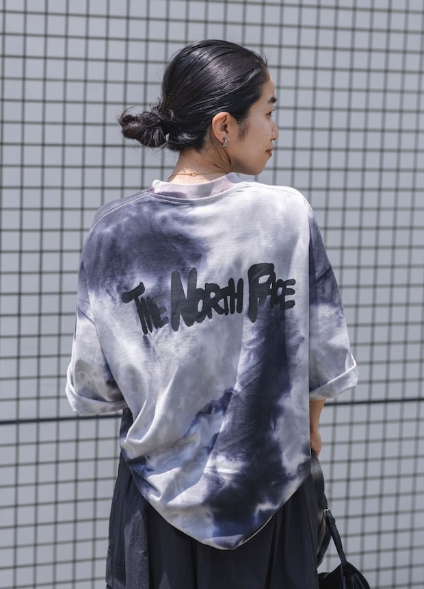 「Tシャツはザ・ノース・フェイスのオーガニックコットン製。夏らしいタイダイ柄は、派手にならないようにモノトーンコーデでまとめました。TシャツはあえてメンズのMサイズを緩いシルエットで。カジュアルになり過ぎないようにサンダルやバッグをブラックレザーで統一しています」