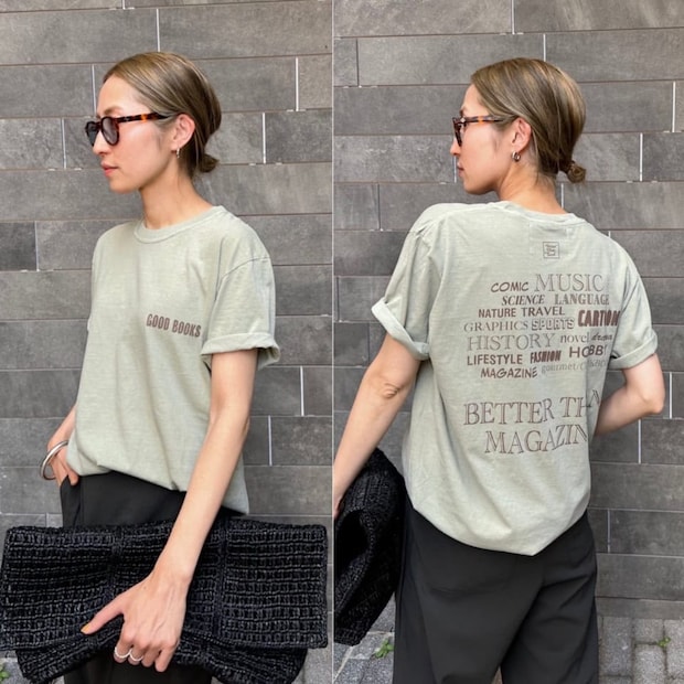 「フレームワークでも人気のブランド、ベターザングッド。今シーズンのTシャツはさまざまなフォントが施されたバックプリント&デザインでシンプルスタイルにも映えてすごく可愛い。このニュアンスカラーにブラウンのロゴカラーがまた惹かれるんです。合わせやすいサイズ感も気に入っています」Tシャツ¥9,680(ベターザングッド/フレームワーク ルミネ新宿店)