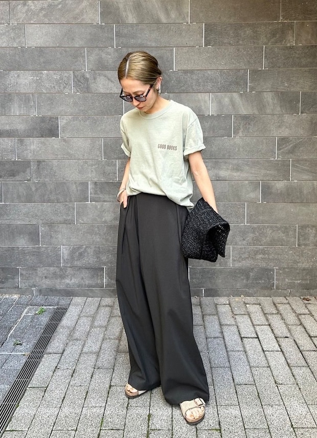 Tシャツ¥9,680(ベターザングッド)、ラップワイドパンツ¥18,150(フレームワーク)、クラッチバッグ¥44,000(メゾン エヌ アッシュ パリ)、サンダル¥17,600(ビルケンシュトック/全てフレームワーク ルミネ新宿店)