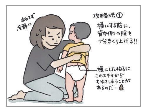 オムツがまだテープタイプの時は特に、オムツの背中側の部分がゆるいので、横にした拍子にそのスキマから溢れてしまう構造になってるんですよね。なので、ウンチを感知したら、すぐに横にするのではなく、慌てず冷静に、まず服をまくり上げる。これがとても大事です。