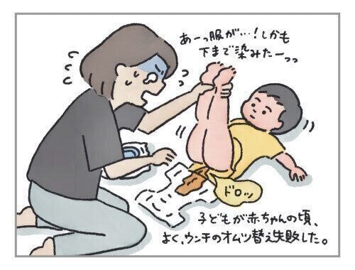 子どもが赤ちゃんの頃、よく、ウンチのオムツ替えを失敗していました。ウンチの音や匂いに気づくと、すぐにオムツ替えの体勢にしていたのですが、その時にオムツから漏れてしまったり、その漏れたものがさらに下まで染みてしまったり・・・。オムツ替えは、いつもそういった危険と隣り合わせだったのです!!