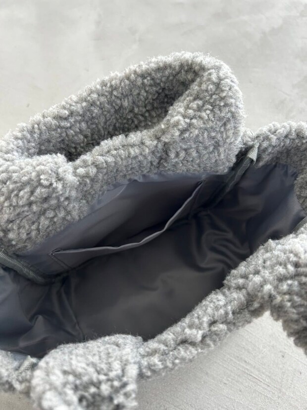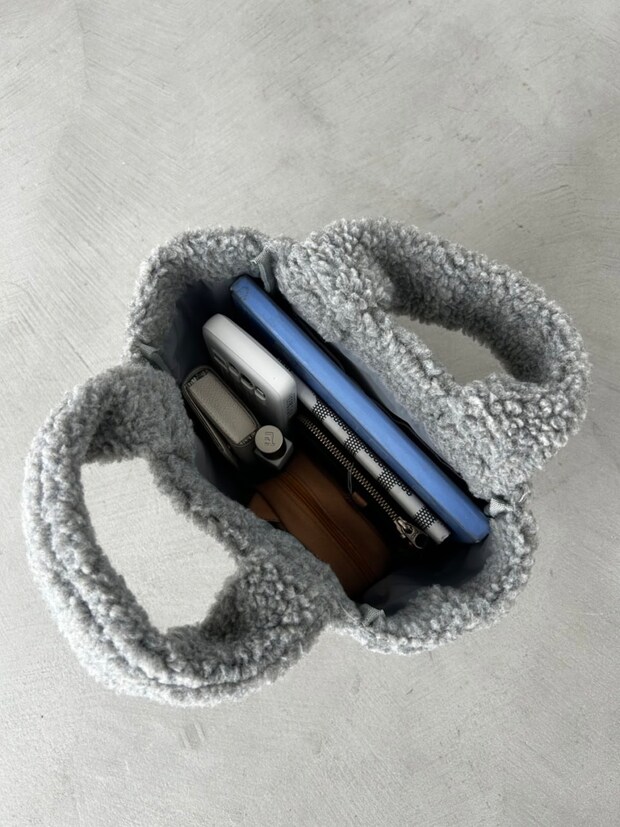 持ち手までしっかりふわふわ。マットな質感でほどよくカジュアルさを抑えた高級感のある素材感です。
