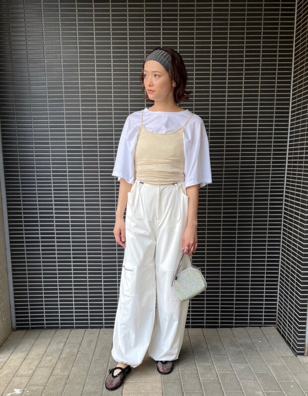 「キャミとセットになっているTシャツはMM6のもの。キャミの内側であえて白Tをクチャクチャにして着るのがポイント。袖丈も着丈も長めなのでアウトして着ても可愛いんです」MM6のTシャツは本人私物