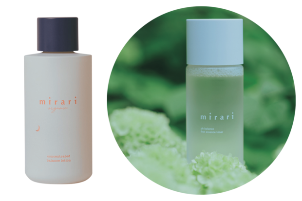 スチーマーを使って入れ込んでいる化粧水。ミラリ オーガニックコンセントレーティッドバランスローション¥4,180、ミラリ PHバランスファーストエッセンストナー¥2,970(共にコスメ キッチン)