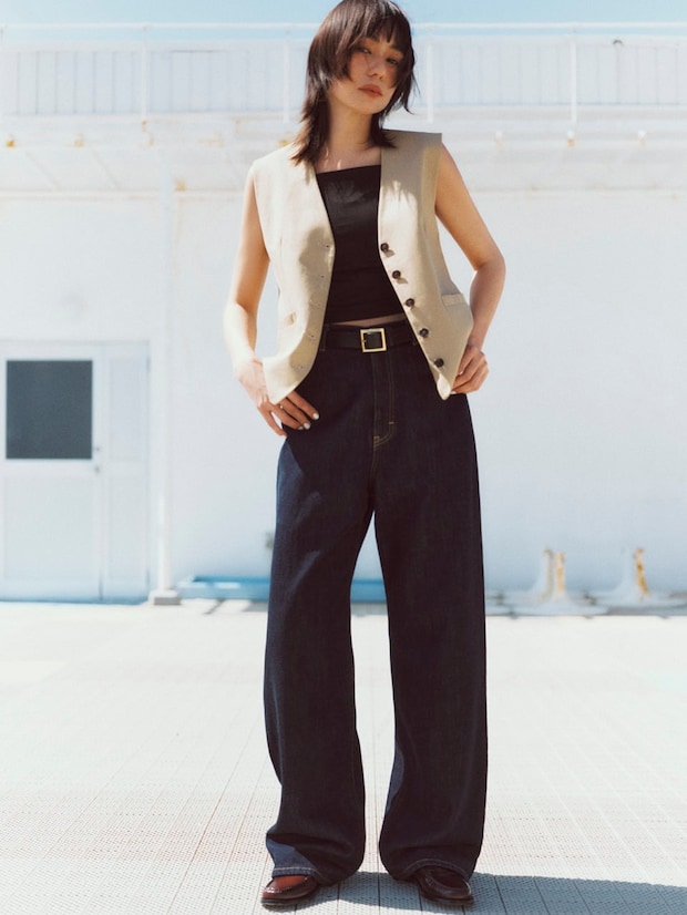 おなじくアメリカ発ブランドのLEEに別注したハイウエストデニム。ルーズなシルエットが今の気分にぴったりで、流行りのクロップト丈トップスとも相性抜群。ベストをプラスすることで、単調になりがちな夏コーデにメリハリがつきます。