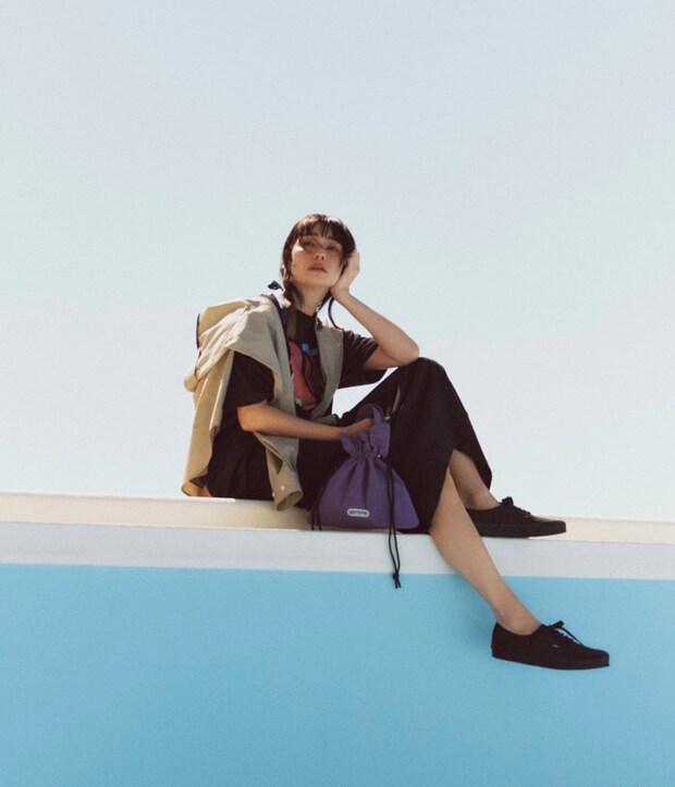 古着のようなカラーリングが印象的なTシャツを主役にしたコーディネート。ロングスカートにはもちろん、デニムやチノパンに合わせる選択も。巾着の「EVERYDAY BAG」は、シャカシャカとしたナイロン素材で非常にタフ。気づけば日々の相棒となっている。全体的に手が届きやすいプライス設定も嬉しい!